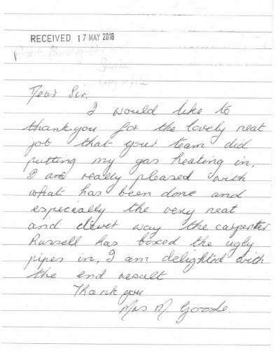 We recently received this lovely handwritten note from a happy customer after installing a new gas heating system. It’s always great to receive positive feedback after completing a job, so we were very happy to receive this letter. Take a look at the note below or see below the letter for a full transcription. For […]